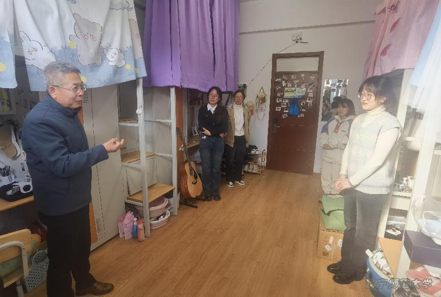 研究生寝室,深入“一站式”学生社区开展工作,调研学生生活、学习、就业方面的困难和疑惑,以及需要协调解决的问题。关部长实地查看了学生寝室住宿条件,了解学生生活方面是否有需要解决的问题并与学生交流专业学习情况,进而给出学业和职业生涯发展规划方面的建议,同时鼓励大家加强锻炼、增强体魄,实现全面发展。