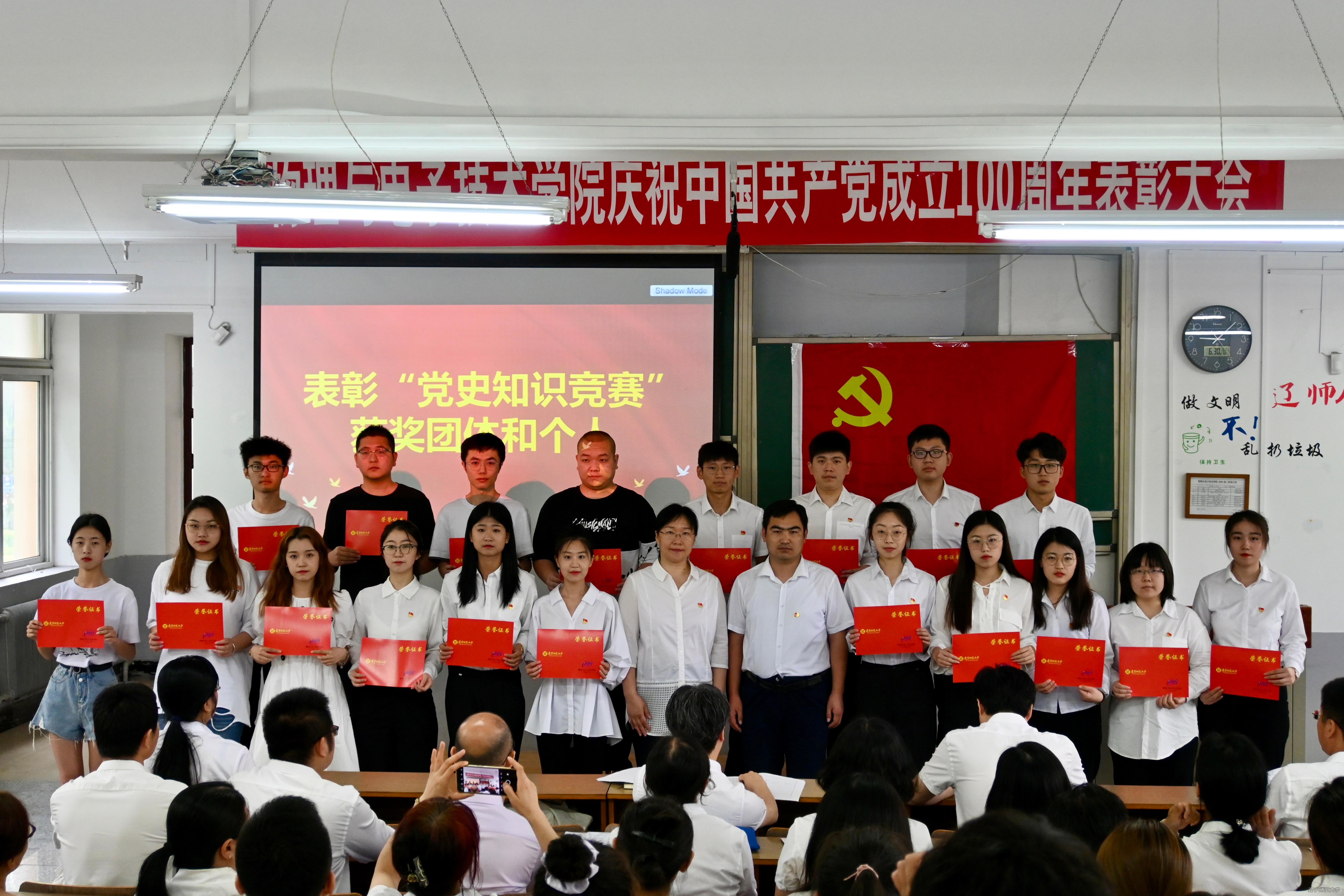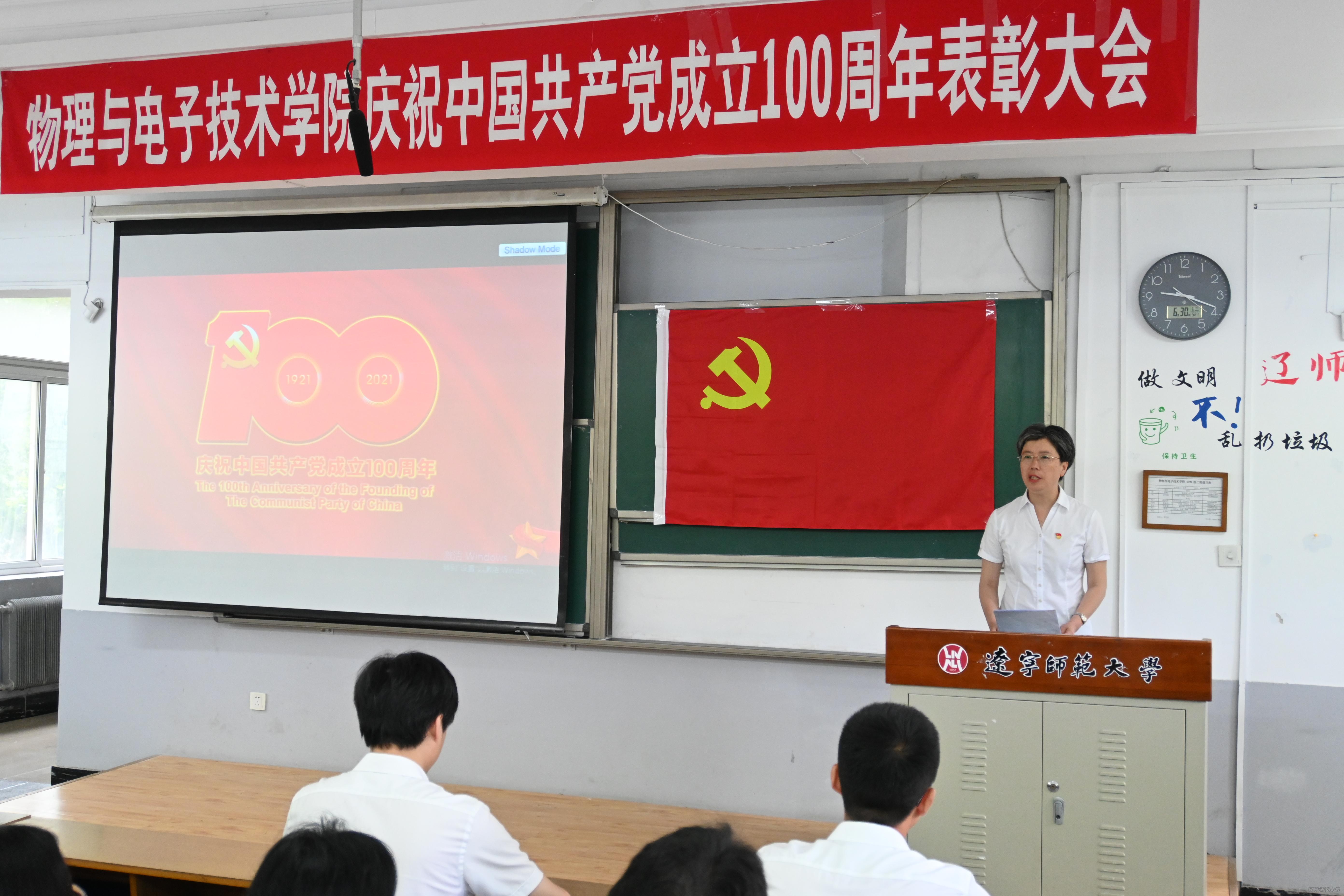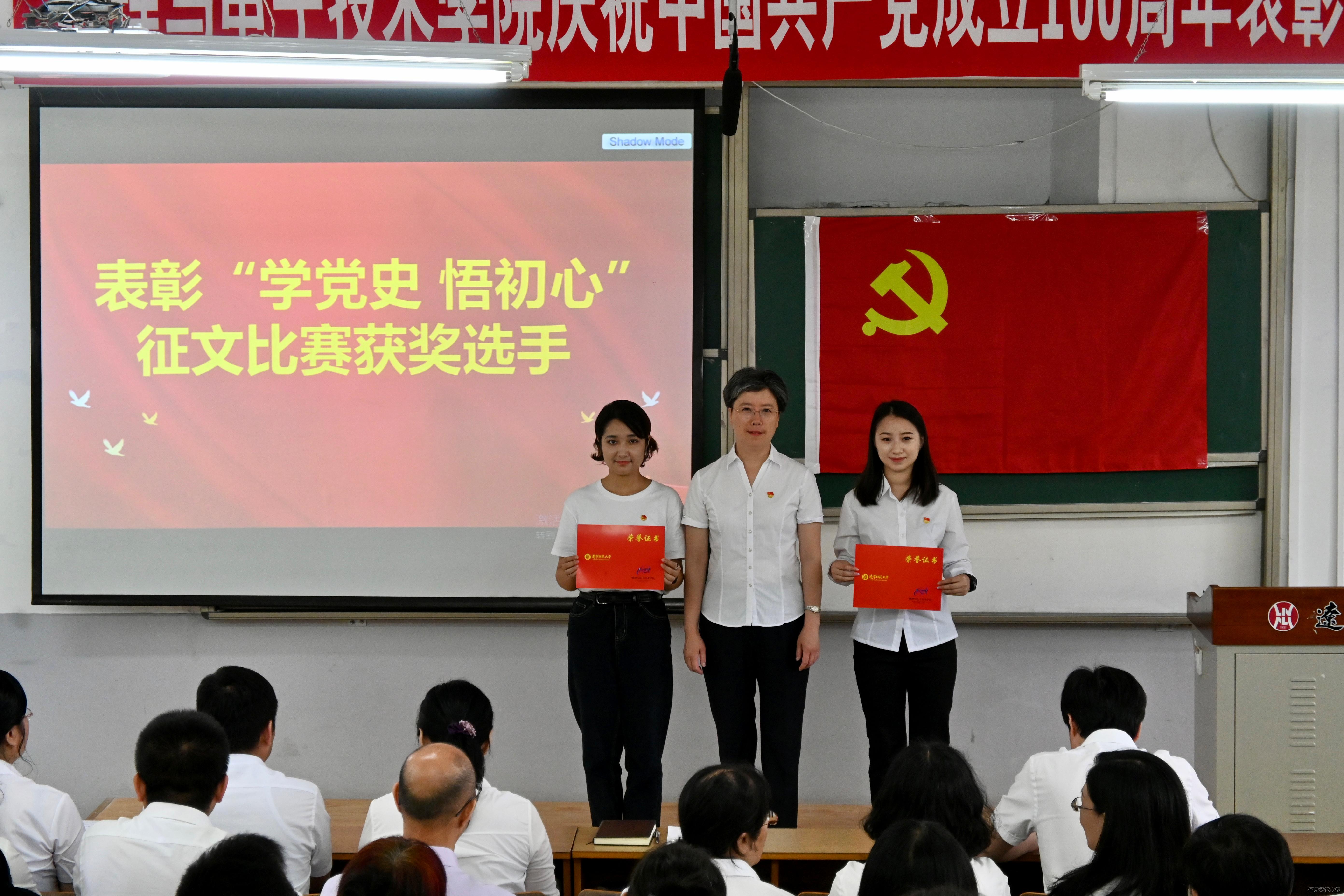 举办庆祝中国共产党成立100周年表彰大会暨“永远跟党走”诗歌朗诵活动,出席大会的有:学院党委书记曲建辉同志、党委副书记、院长孙景昌同志、学院党委委员、班子成员、全体师生党员及获奖同学代表,表彰大会由学院党委副书记李孝君主持。
