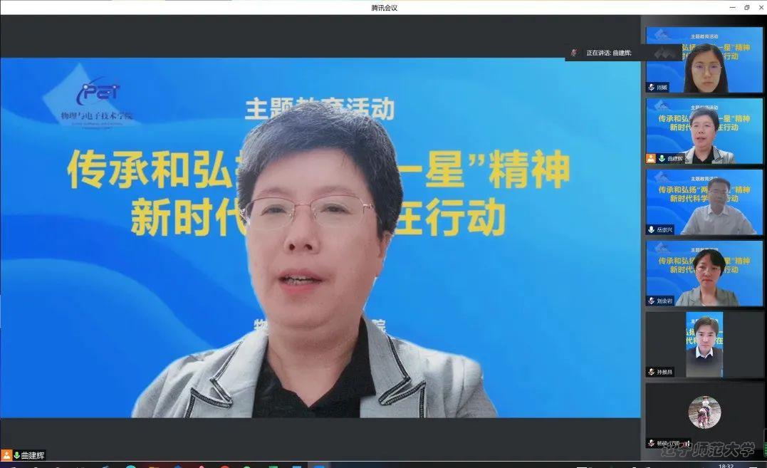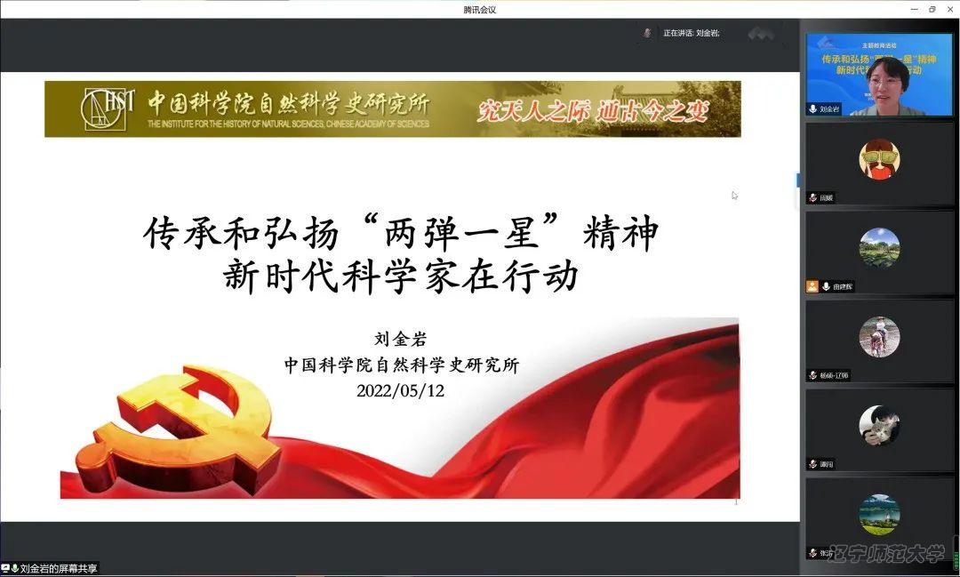 于5月12日18:30组织了题为 “传承和弘扬 ‘两弹一星’精神,新时代科学家在行动” 的云端主题教育报告会。报告人为优秀校友,中国科学院自然科学史研究所副研究员,世界科技史研究室副主任刘金岩。副校长岳崇兴教授、学院领导班子成员、全体党员师生,2022届毕业生以及2021级本科生和研究生近300人参加了线上报告会。会议由学院党委书记曲建辉主持。