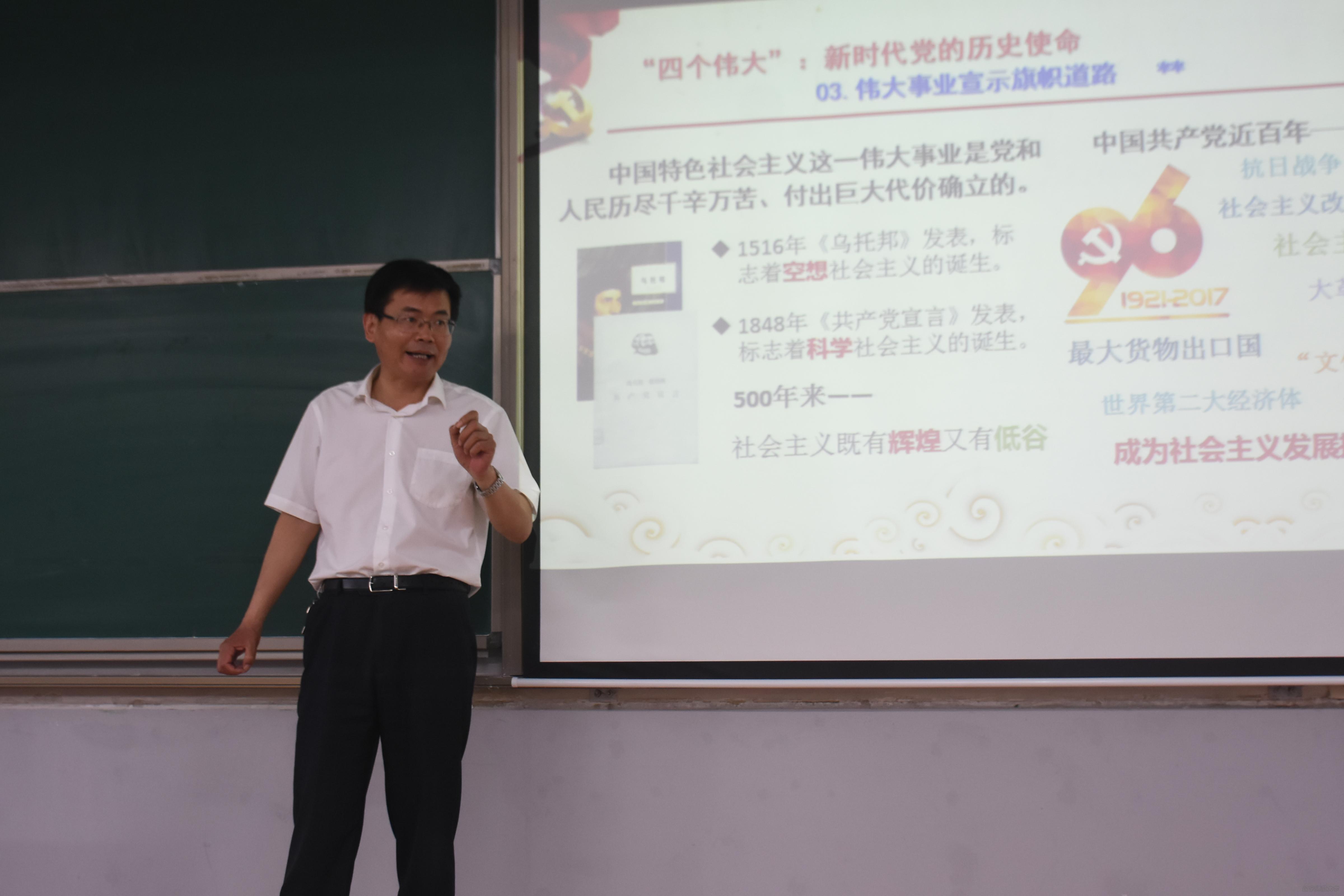 岳崇兴副校长首先强调了形势与政策课在大学生思想政治教育工作中的重要地位。接着用独特的物理学视角,以时间为轴,以历史为面,带领同学们走进共产党人的“初心”与“使命”。岳校长与同学们共同回顾了中国共产党的诞生与发展历程,强化了同学们对信仰的认识与理解。随后,岳校长用大量的数据和图表,详细阐述了“四个伟大”的深刻内涵和重大意义,他指出,我们在学习中既要把握“四个伟大”之间“紧密联系、相互贯通、相互作用”的内在关系,又要深刻认识伟大梦想在“四个伟大”中的关键位置。他结合自身学习十九大精神的心得体会,从中国共产党的自信来源于其交出的实实在在的答卷和来源于中国政治制度的鲜明优势两个方面作了详细的解读。最后,岳校长指出,我们要坚决维护党中央权威和集中统一领导,落实中央八项规定精神,营造风清气正的政治生态环境而不懈努力。