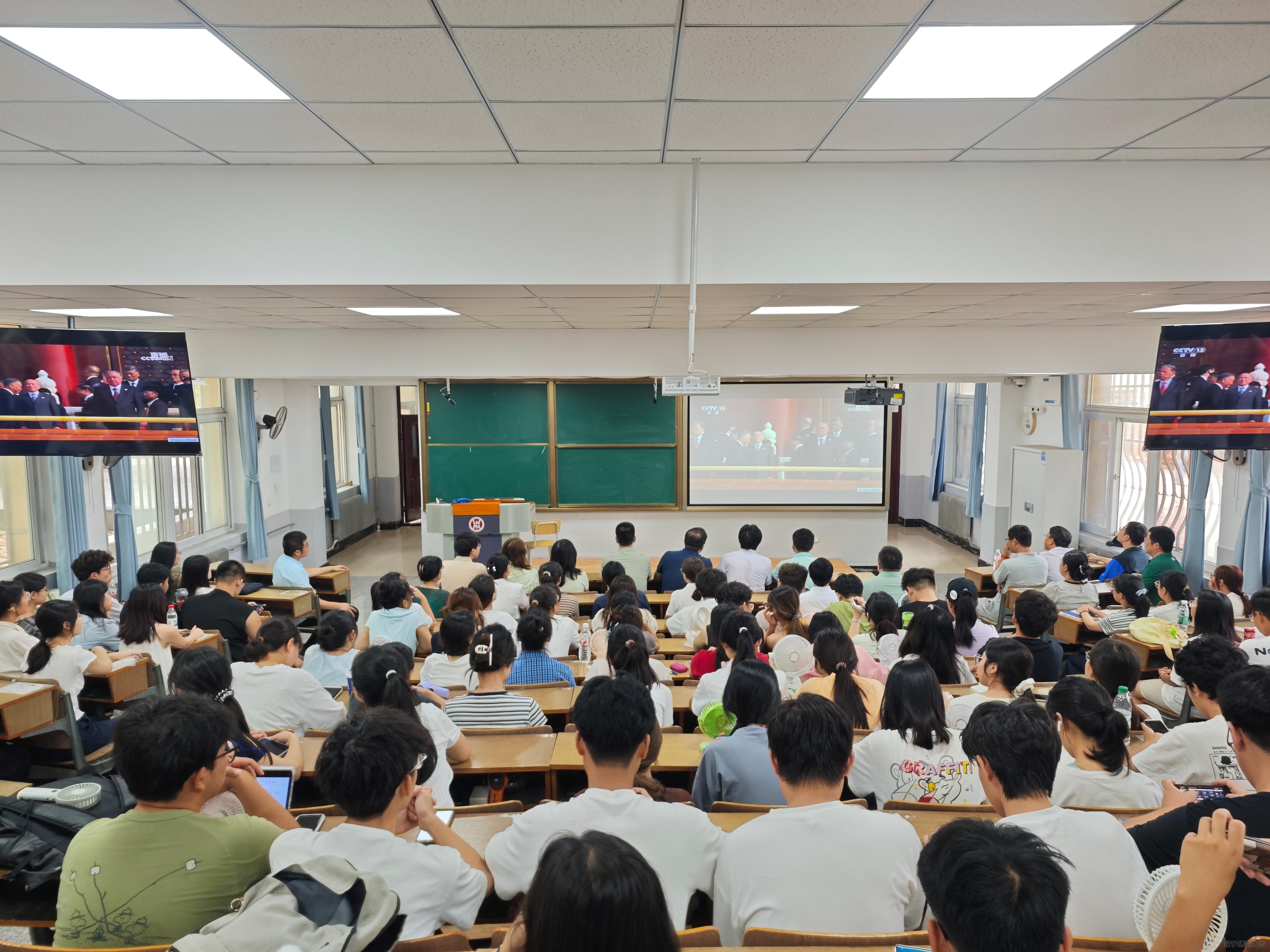 9月3日上午,北京天安门广场隆重举行纪念中国人民抗日战争暨世界反法西斯战争胜利80周年大会,学院组织部分在校教师以及学生代表在外语楼第二合堂教室共同观看直播,激发师生爱国热情,现场气氛庄重热烈。