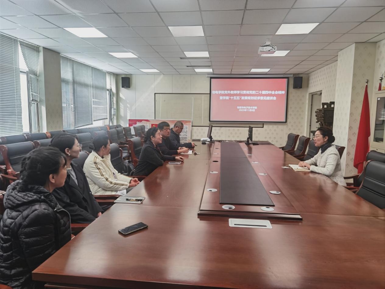 为深入学习贯彻党的二十届四中全会精神和习近平总书记在党外人士座谈会上的重要讲话精神,进一步强化思想政治引领,团结引导民主党派、无党派人士,围绕中心大局,积极为科学编制学院“十五五”发展规划献计出力,11月6日,学院召开党外教师学习贯彻党的二十届四中全会精神暨学院“十五五”发展规划征求意见会。学院党委书记李凝主持会议并讲话,学院民主党派教师、无党派人士参加了此次会议。